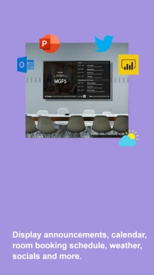 Integration include: Google, Microsoft calendar, room booking schedule, weather, LinkedIn, Facebook, Instagram, Twitter, and more.